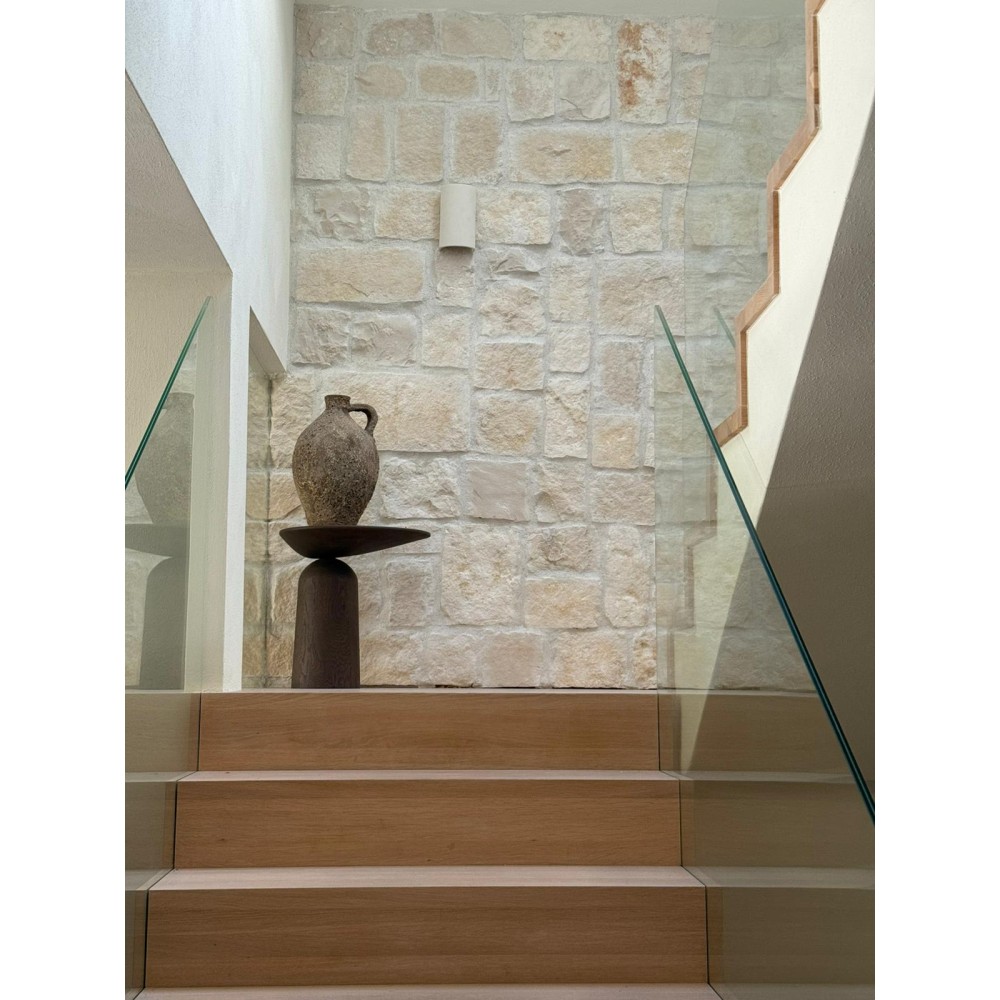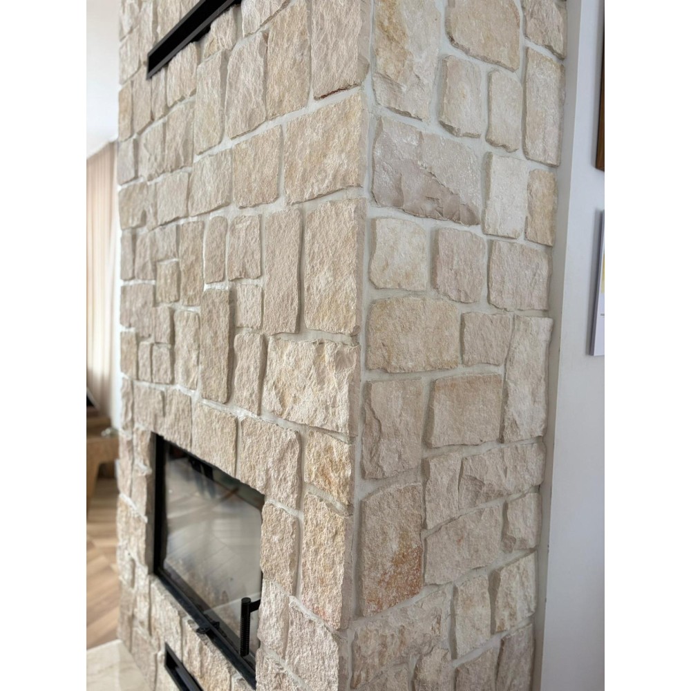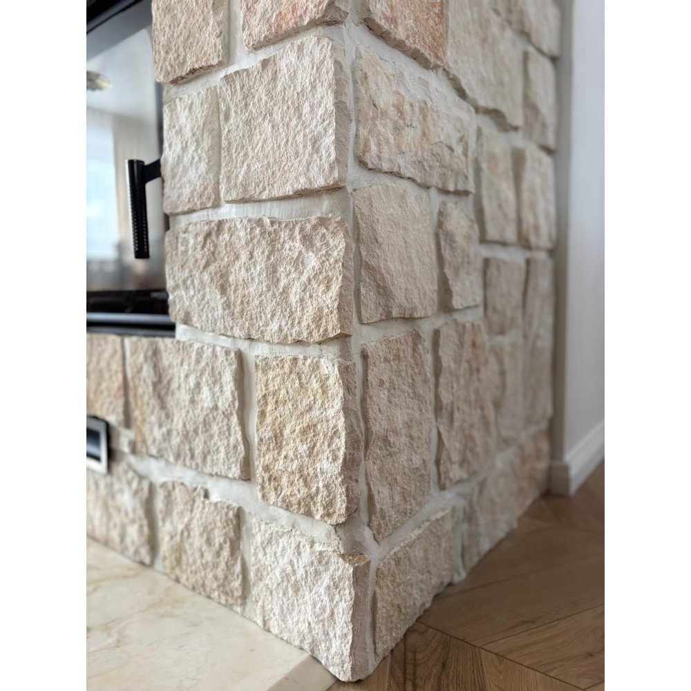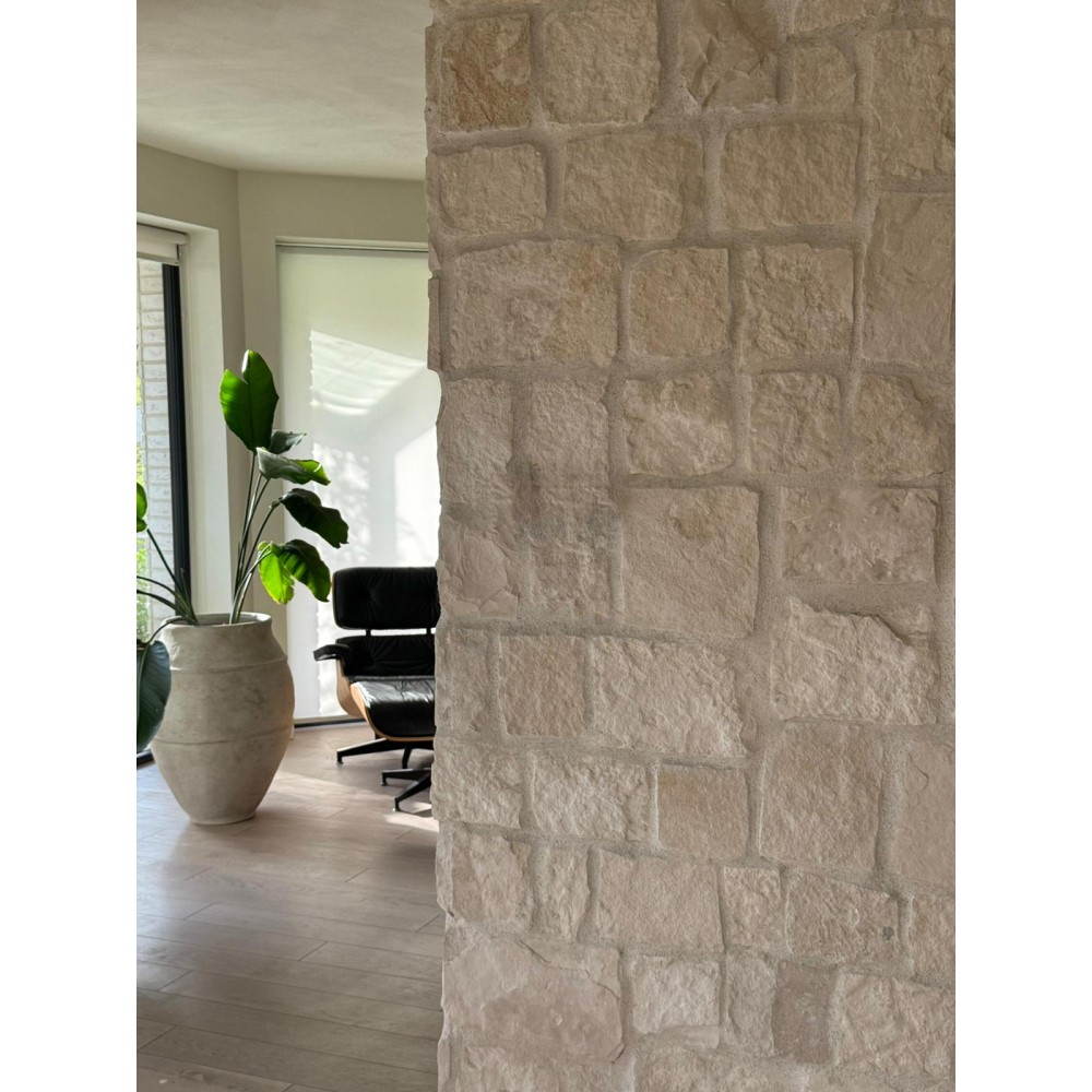 Śmietankowy wapień o łupanej strukturze, pasujący do stylu farmhouse, prowansalskiego jaki i rustykalnego.