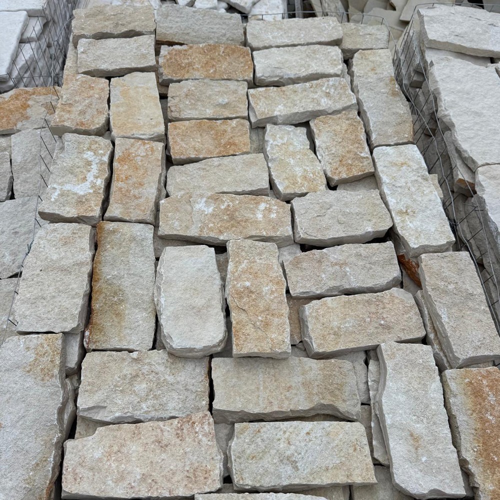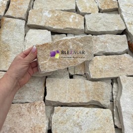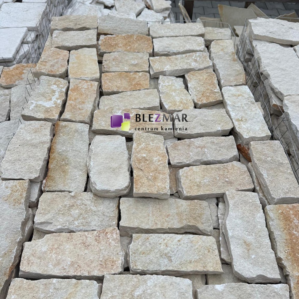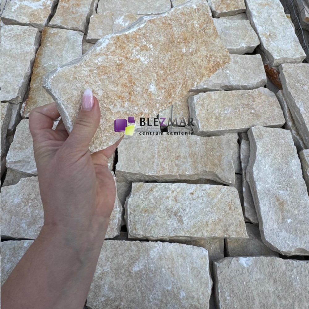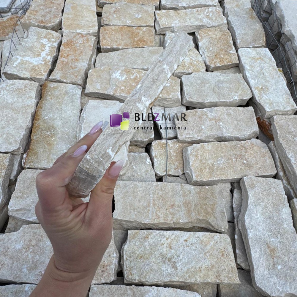Kamień Oregon to naturalny kamień dekoracyjny w kolorach beżowo-kremowych z delikatnymi przebarwieniami w odcieniach żółci i rdzy (kolory ziemi). Jego powierzchnia jest łupana, co nadaje mu surowy, rustykalny wygląd, a nieregularne krawędzie dodają naturalnego charakteru.