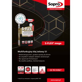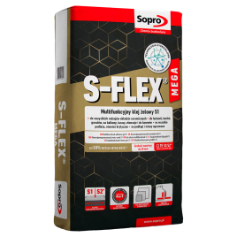 Wysokoelastyczna, odkształcalna zaprawa klejowa S-FLEX mega to nowoczesna, cementowa zaprawa klejowa wzbogacona o włókna i tworzywa sztuczne, opracowana w technologii hydrożelowej. Jest przeznaczona do stosowania wewnątrz i na zewnątrz budynków, w pomieszczeniach mokrych i wilgotnych, na ogrzewaniu podłogowym i ściennym, tarasach, balkonach oraz elewacjach.