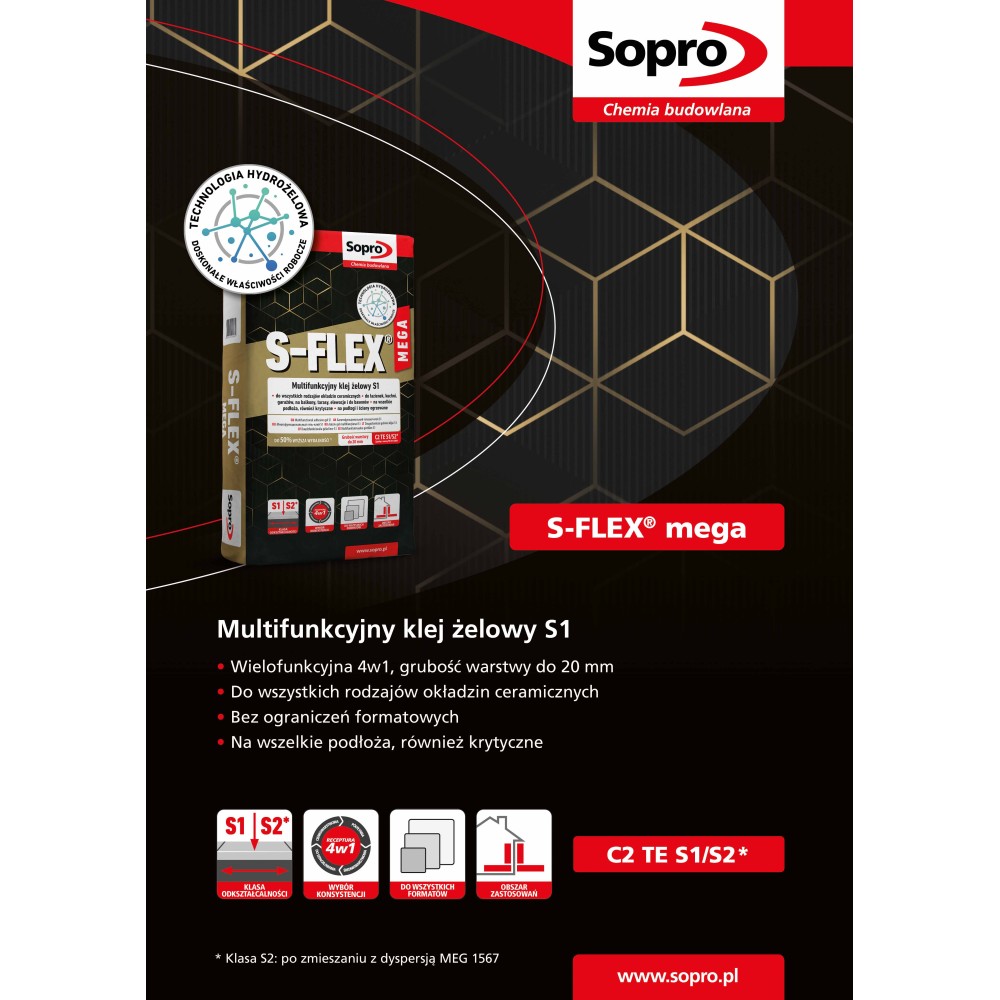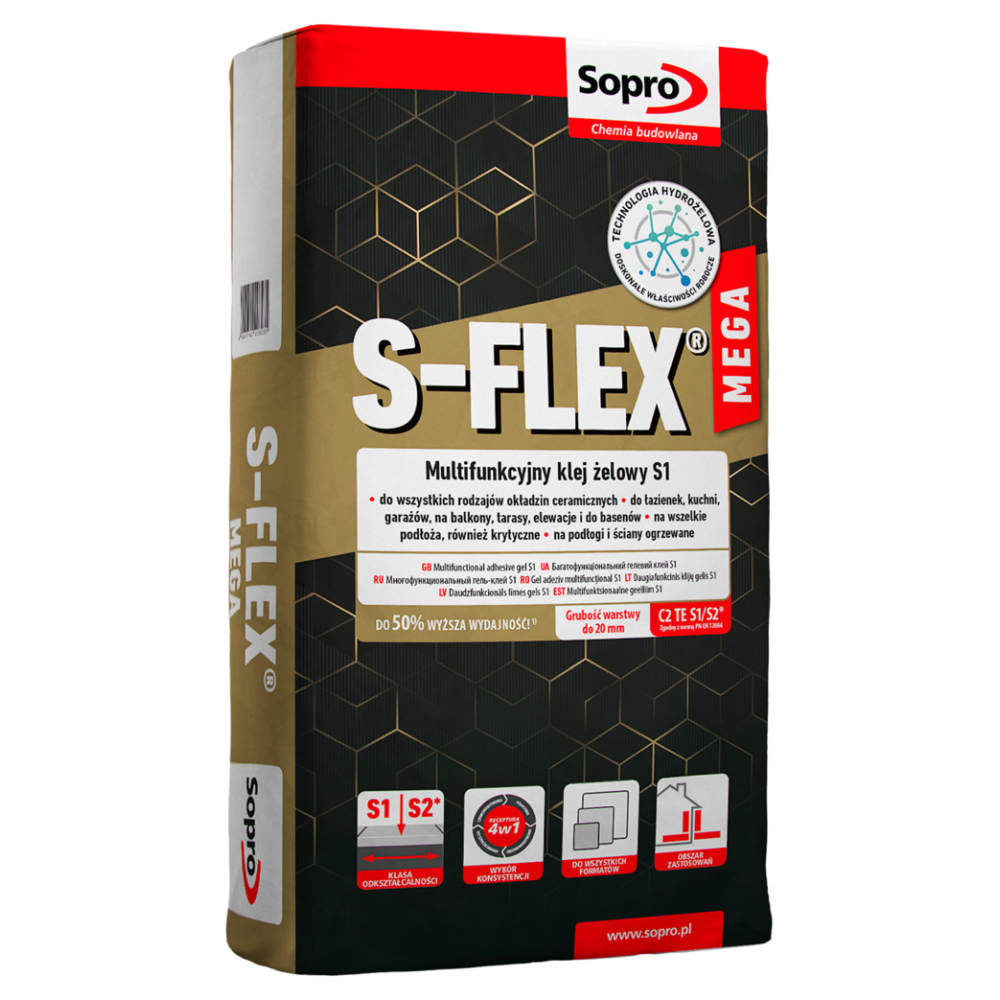 Wysokoelastyczna, odkształcalna zaprawa klejowa S-FLEX mega to nowoczesna, cementowa zaprawa klejowa wzbogacona o włókna i tworzywa sztuczne, opracowana w technologii hydrożelowej. Zapewnia doskonałą przyczepność i stabilność, idealna do przyklejania wszelkiego rodzaju płytek ceramicznych, gresu, mozaiki oraz kamienia naturalnego. Dzięki zastosowaniu hydrożelu, zaprawa zapewnia wyjątkową retencję wody oraz optymalne warunki wiązania i twardnienia, co przekłada się na bardzo dobre parametry robocze i techniczne.