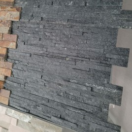 Czarny kwarcyt w postaci panela ściennego, który nadaje się do wyłożenia fragmentów elewacji budynku jak również cokołów, podmurówek jak i ogrodzeń.