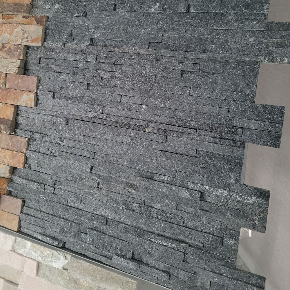 Czarny kwarcyt w postaci w panela dekoracyjnego PE08 Black 10 pasków, emanuje niezwykłym wdziękiem, który mieni się delikatnie pod wpływem promieni słonecznych. Ten wyjątkowy panel, złożony z czarnych kamieni , prezentuje się niezwykle efektownie, gdy padają na niego promienie słoneczne. Jego unikalna cecha, czyli zdolność do subtelnej zmiany odcienia w zależności od kąta padania światła, sprawia, że staje się on centralnym punktem uwagi. Nadaje się zarówno do obłożenia elementów cokołu domu, strefy wejścia jak również sprawdzi się w wiatrołapie i na ścianach wewnętrznych pomieszczeń.