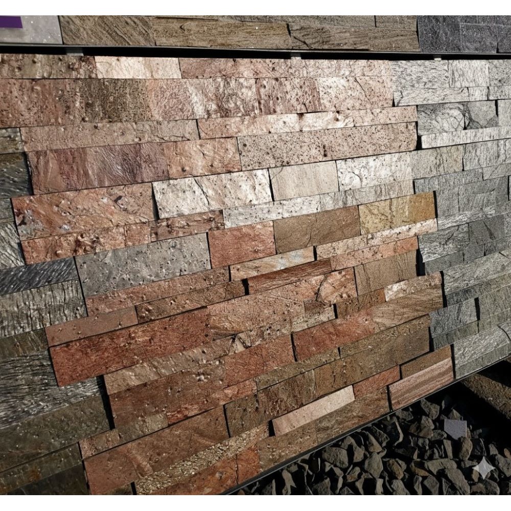 Kamień naturalny skomponowany z małych pasków kamienia naturalnego o ceglanym, metalicznym kolorze