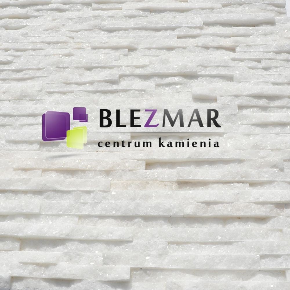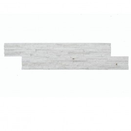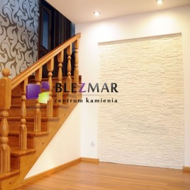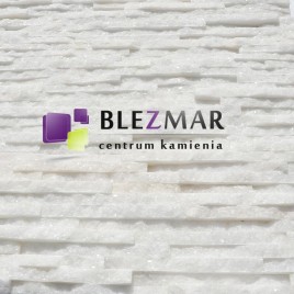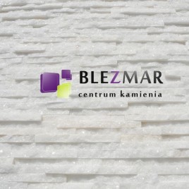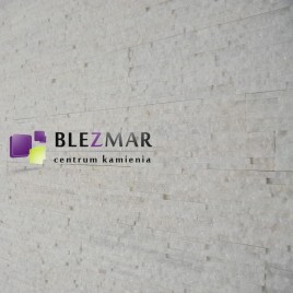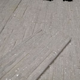 Śnieżnobiały kamień dekoracyjny mieniący się do słońca formowany w wąskie, podłużne paski, doskonale sprawdzi się do aranżacji ścian wewnętrznych.
