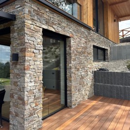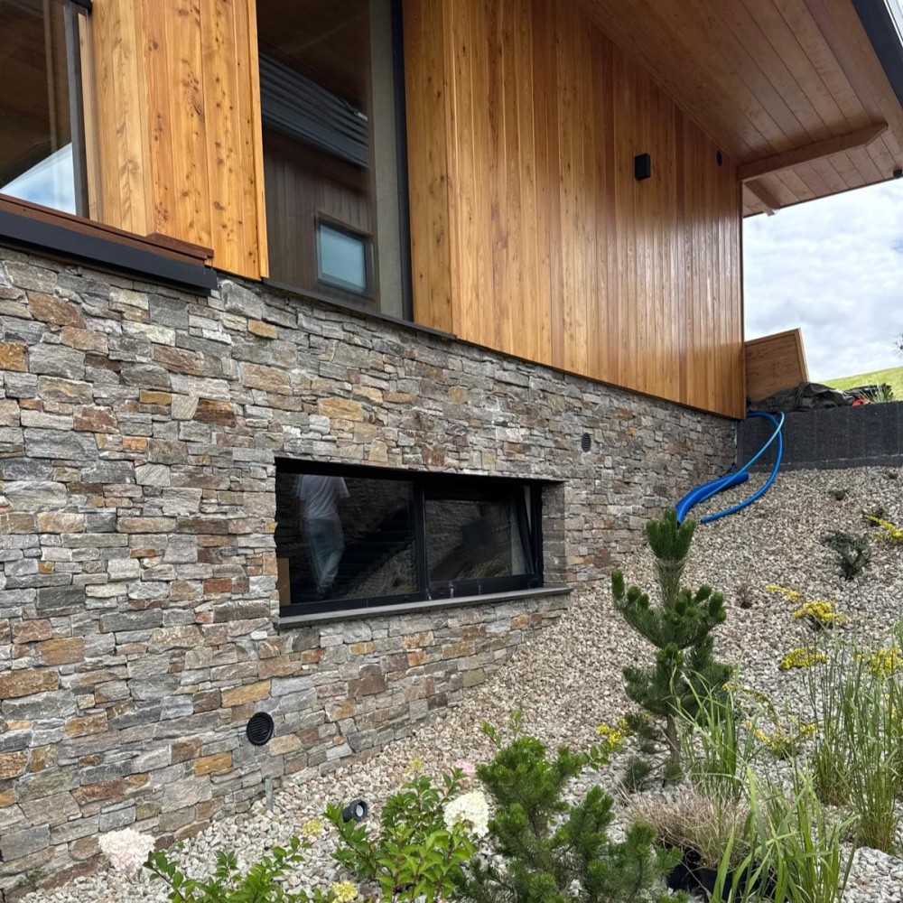 - Tekstura: Naturalnie łupana powierzchnia (split face) nadaje ścianie głębi i trójwymiarowego efektu, przypominającego kamień górski.